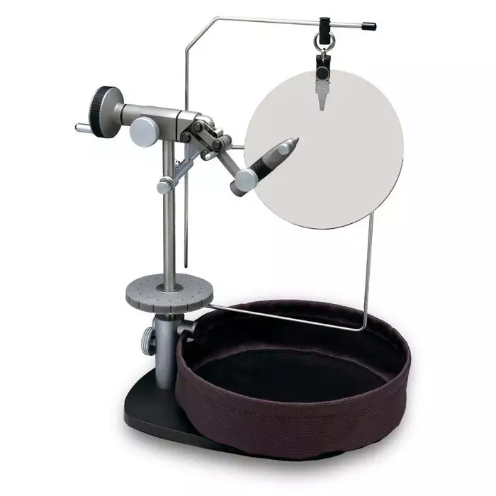 - Temporary hanger, this useful addition holds finished flies on the stem of the vice.
