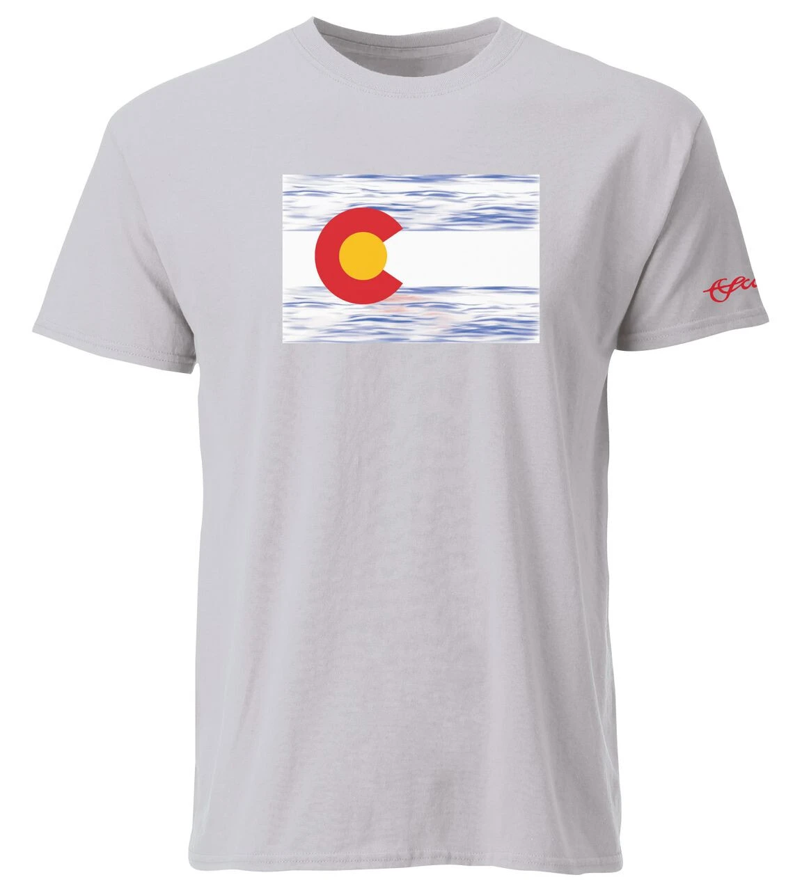Light grey short sleeve t-shirt with Colorado flag reflection logo on front.