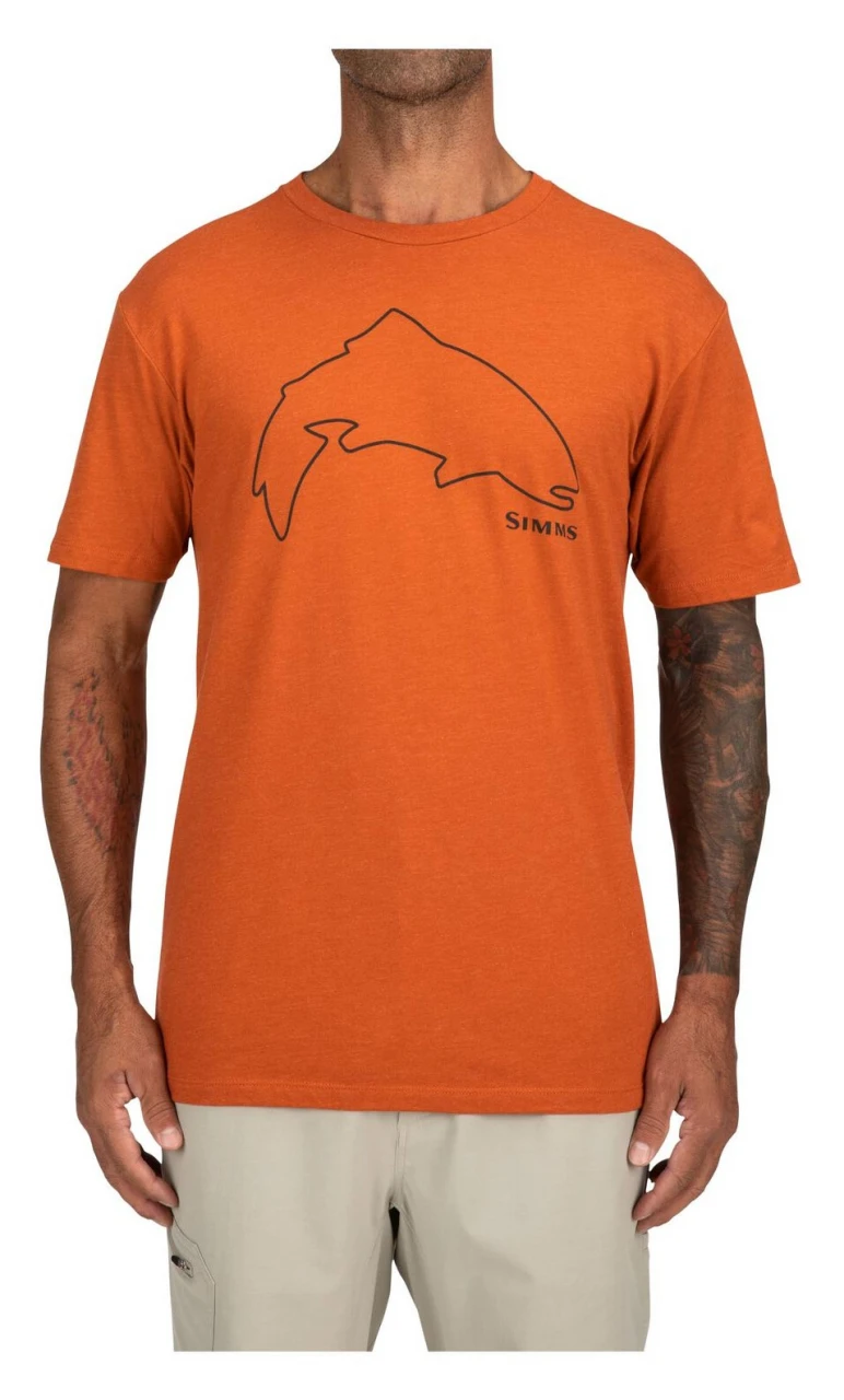 Simms short-sleeved cotton t-shirt with a “Trout” logo. Ideal leisure and fishing clothing for every fly fishing enthusiast! From first haul to last call this smooth wearing cotton blend tee comes equipped with classic Simms logo style.